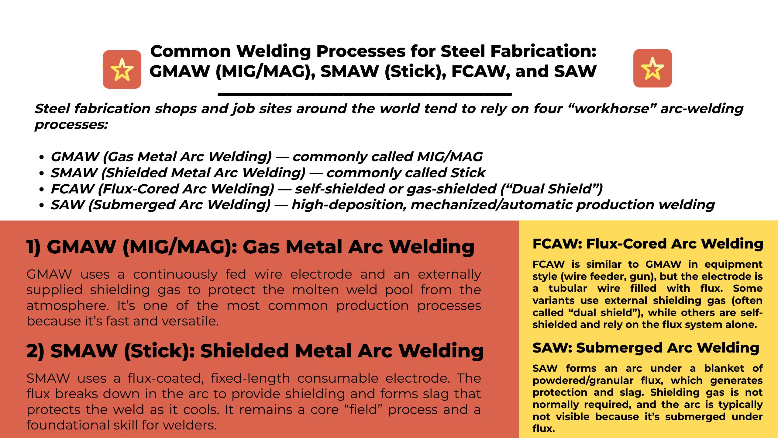 Steel fabrication shops and job sites around the world tend to rely on four “workhorse” arc-welding processes: